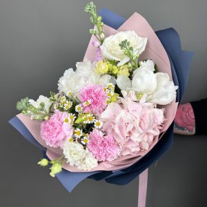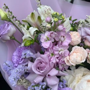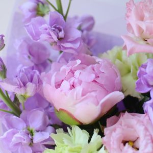 Букет с пионом, маттиолой, розой и эустомой «Счастье»
