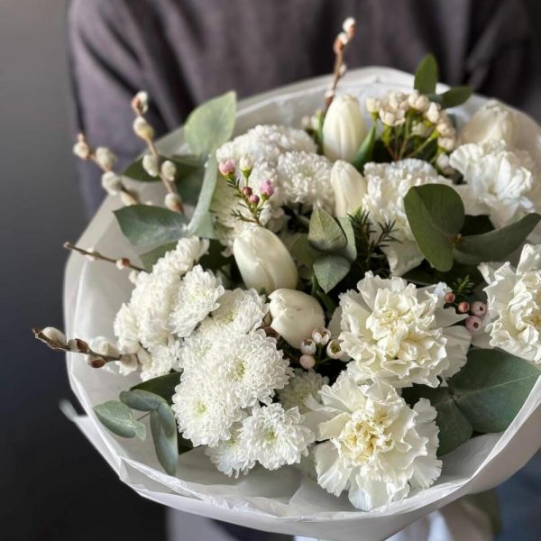 Какой замечательный выбор для букета! Белоснежные тюльпаны символизируют чистоту и искренность, диантусы — это цветы, которые олицетворяют любовь и признательность, а сан тини добавляют легкости и нежности. Такой букет станет прекрасным подарком для девушки и обязательно вызовет улыбку!